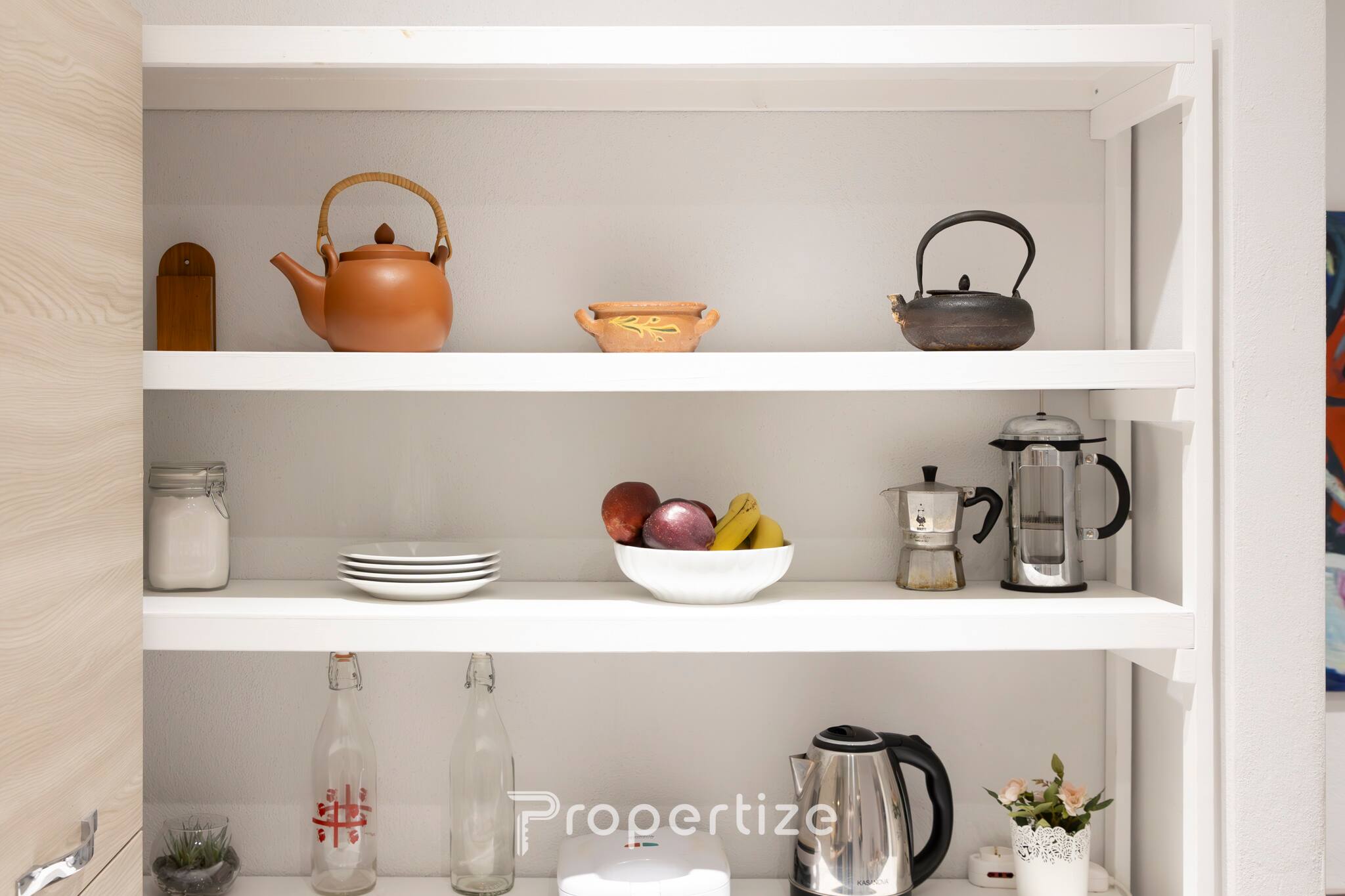 Una cocina completamente equipada con horno, cocina de gas, cafetera moka, hervidor y todos los accesorios esenciales