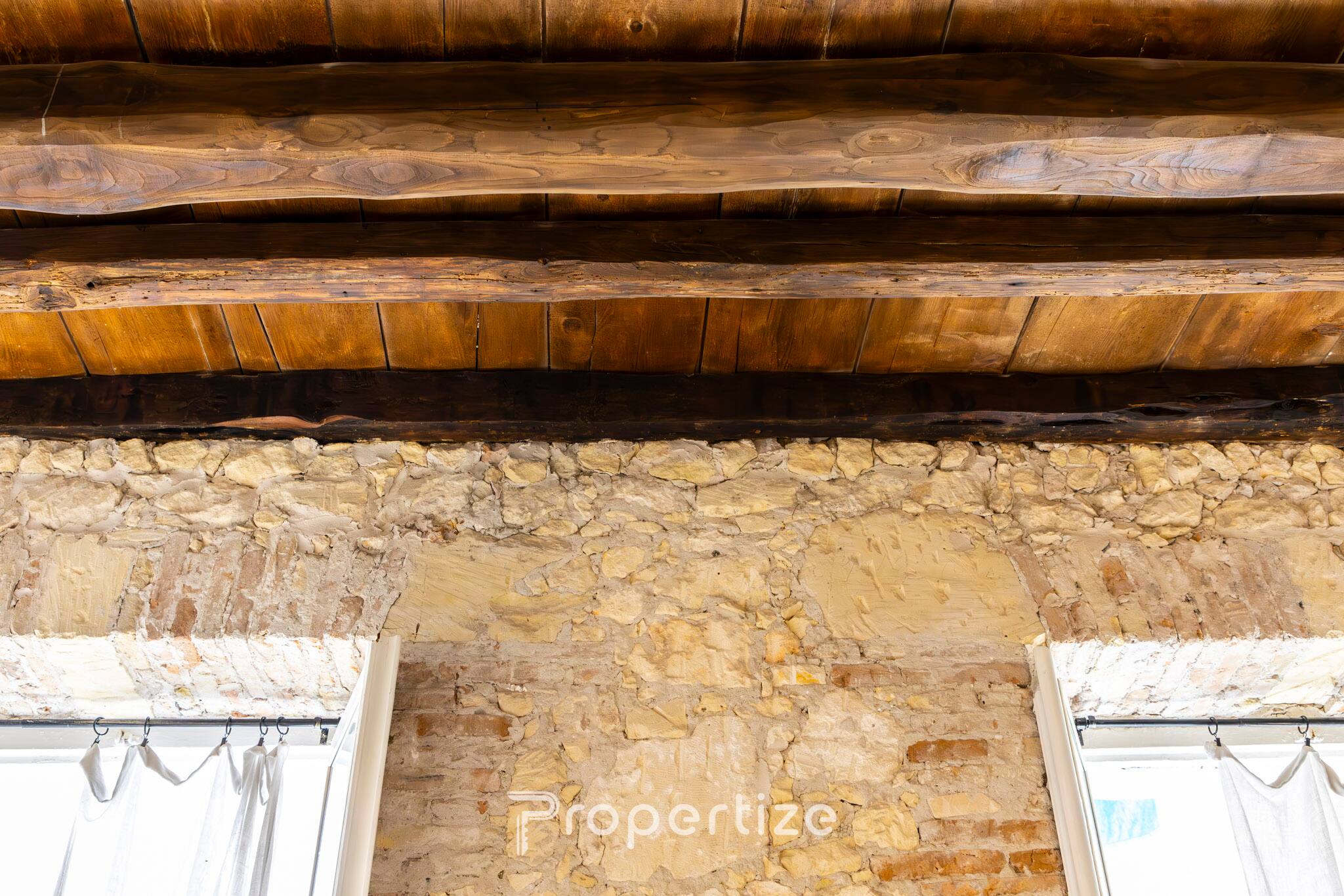 Una habitación doble luminosa y espaciosa con aire acondicionado, armario y detalles de piedra a la vista