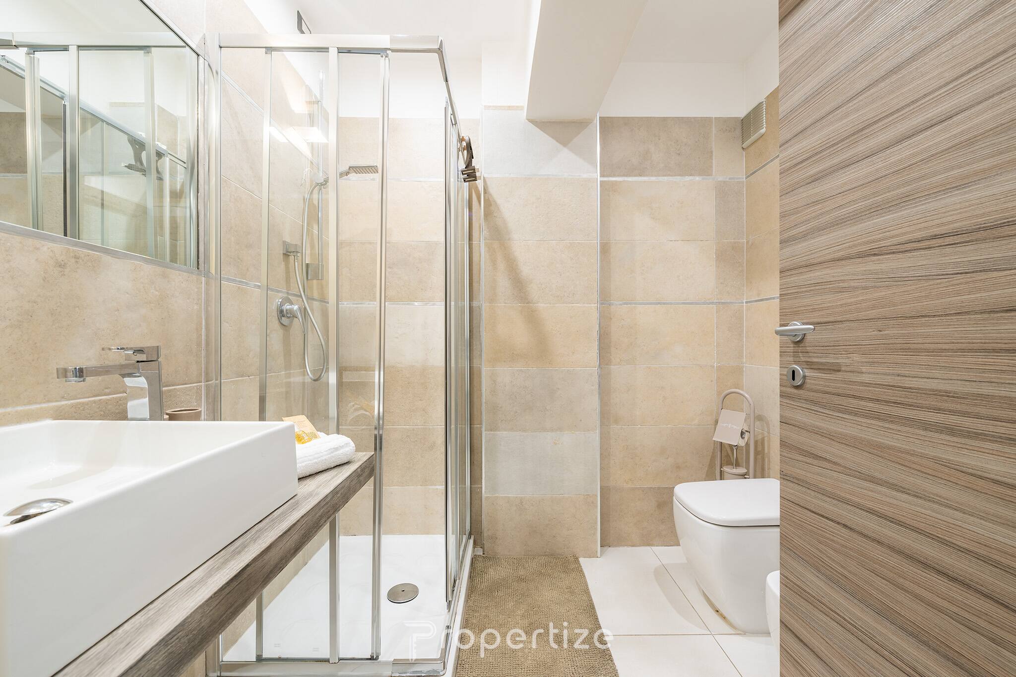 La habitación matrimonial es acogedora y cuidada, con armario a medida y detalles de diseño artesanal que hacen que la atmósfera sea cálida y refinada. El baño, moderno y elegante, ofrece una ducha walk-in, lavabo de diseño y acabados seleccionados.