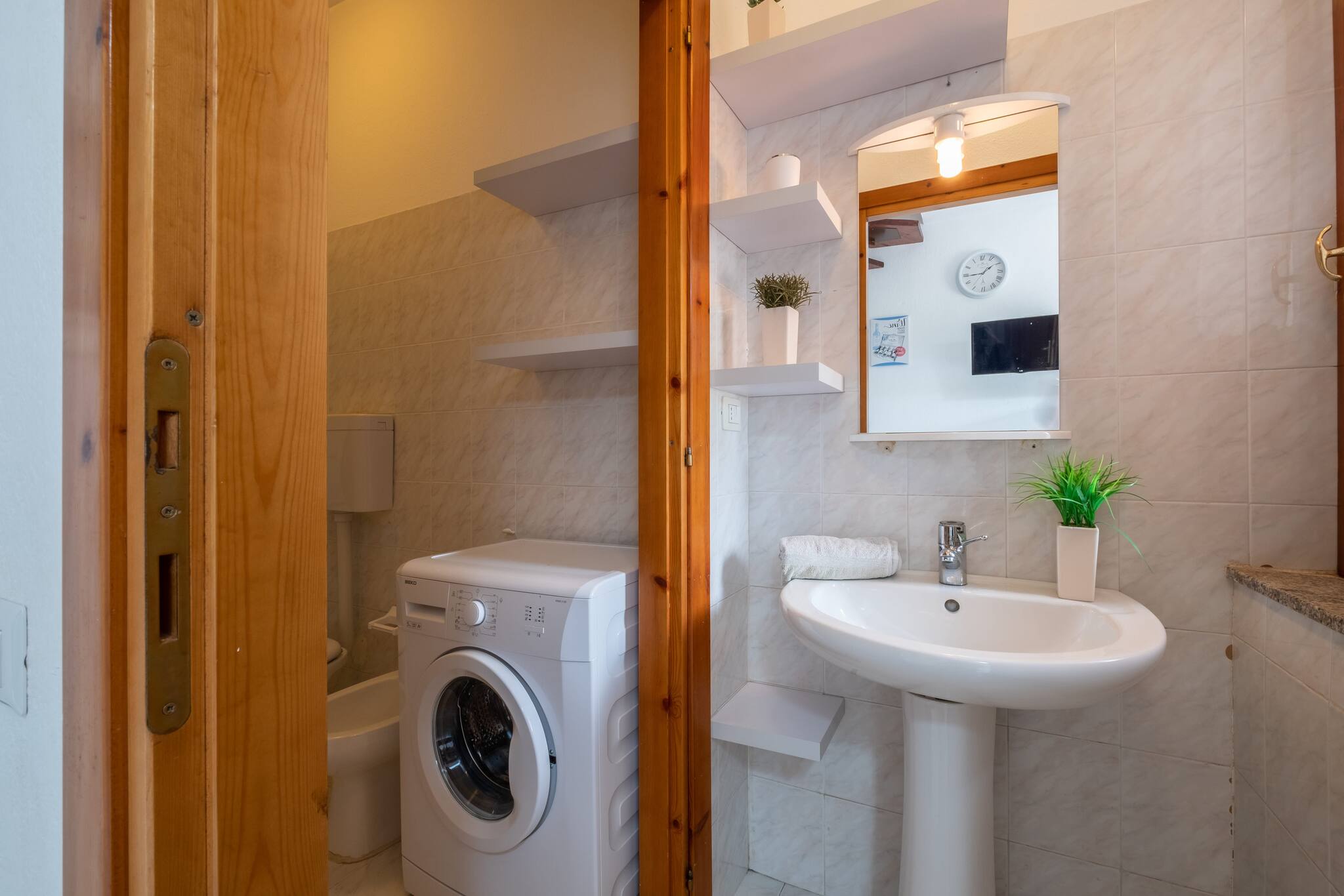 El baño, ubicado en la planta baja, está compuesto por una ducha, una lavadora, un inodoro, un bidé, un secador de pelo y un set de cortesía, además de un juego de toallas para cada huésped.