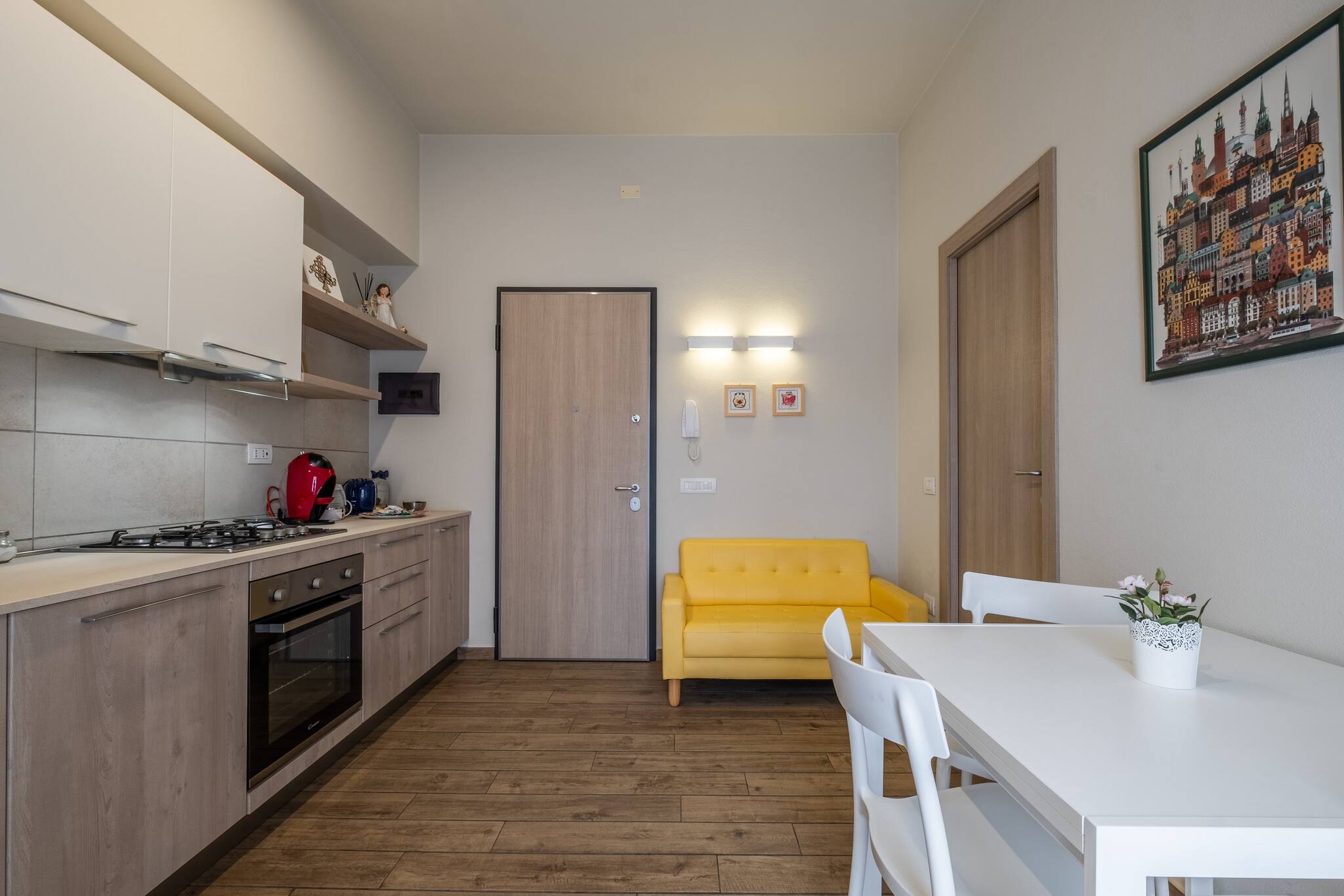 La zone de vie accueille un canapé-lit confortable et une table à manger en bois, accompagnés d'une cuisine super équipée avec plaque à induction, four, micro-ondes, lave-vaisselle, machine à laver et machine à café. La salle de bain, au design contemporain, est complète avec une douche walk-in, un lavabo élégant, un miroir rétroéclairé et des produits de courtoisie.