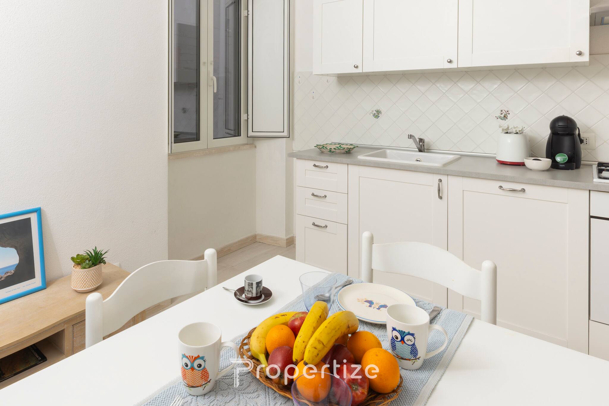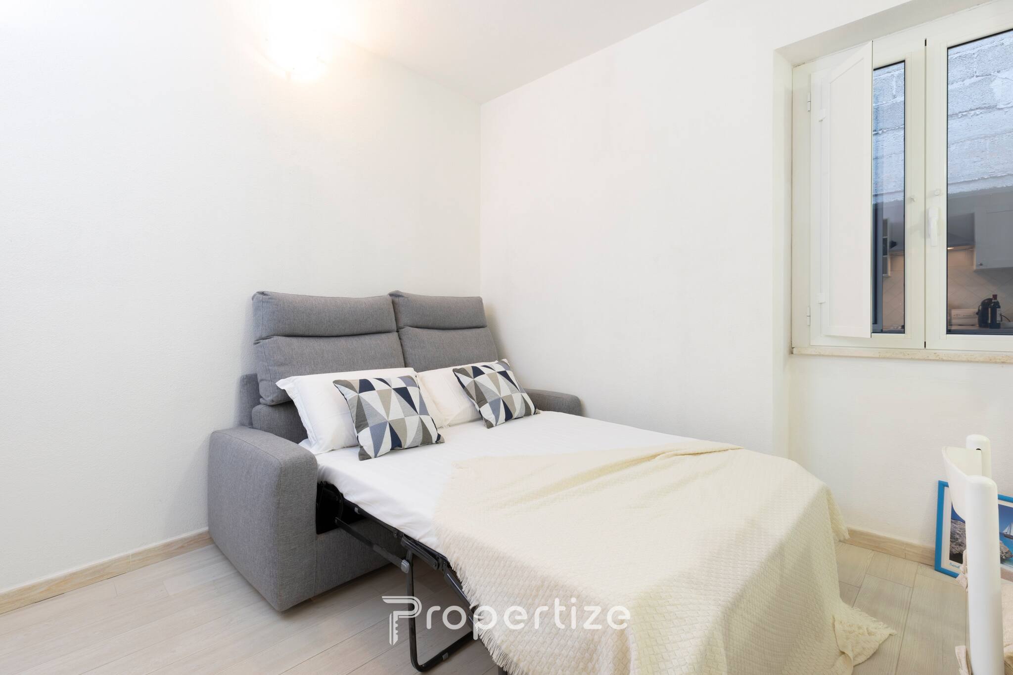 Situé au premier étage sans ascenseur, il peut accueillir confortablement jusqu'à quatre personnes. Les intérieurs, rénovés avec un souci du détail, conservent le charme du bâtiment original tout en offrant fonctionnalité et confort. La chambre principale dispose d'une armoire, d'un miroir et de lumière naturelle, tandis que le canapé-lit dans le salon permet d'accueillir deux autres invités. La cuisine est entièrement équipée avec four, réfrigérateur, lave-vaisselle, machine à café et bouilloire, et la table à manger pour quatre personnes est parfaite pour partager des repas. L'espace détente avec Smart TV, ainsi que le Wi-Fi et la climatisation, garantissent des moments de confort à toutes les saisons. La salle de bain est équipée d'une grande douche walk-in, d'un lave-linge (utile pour les séjours plus longs) et de fournitures de serviettes et d'articles essentiels.