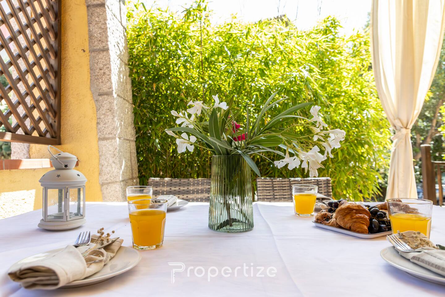 Extérieur : patio couvert avec table à manger et espace détente au milieu de la verdure