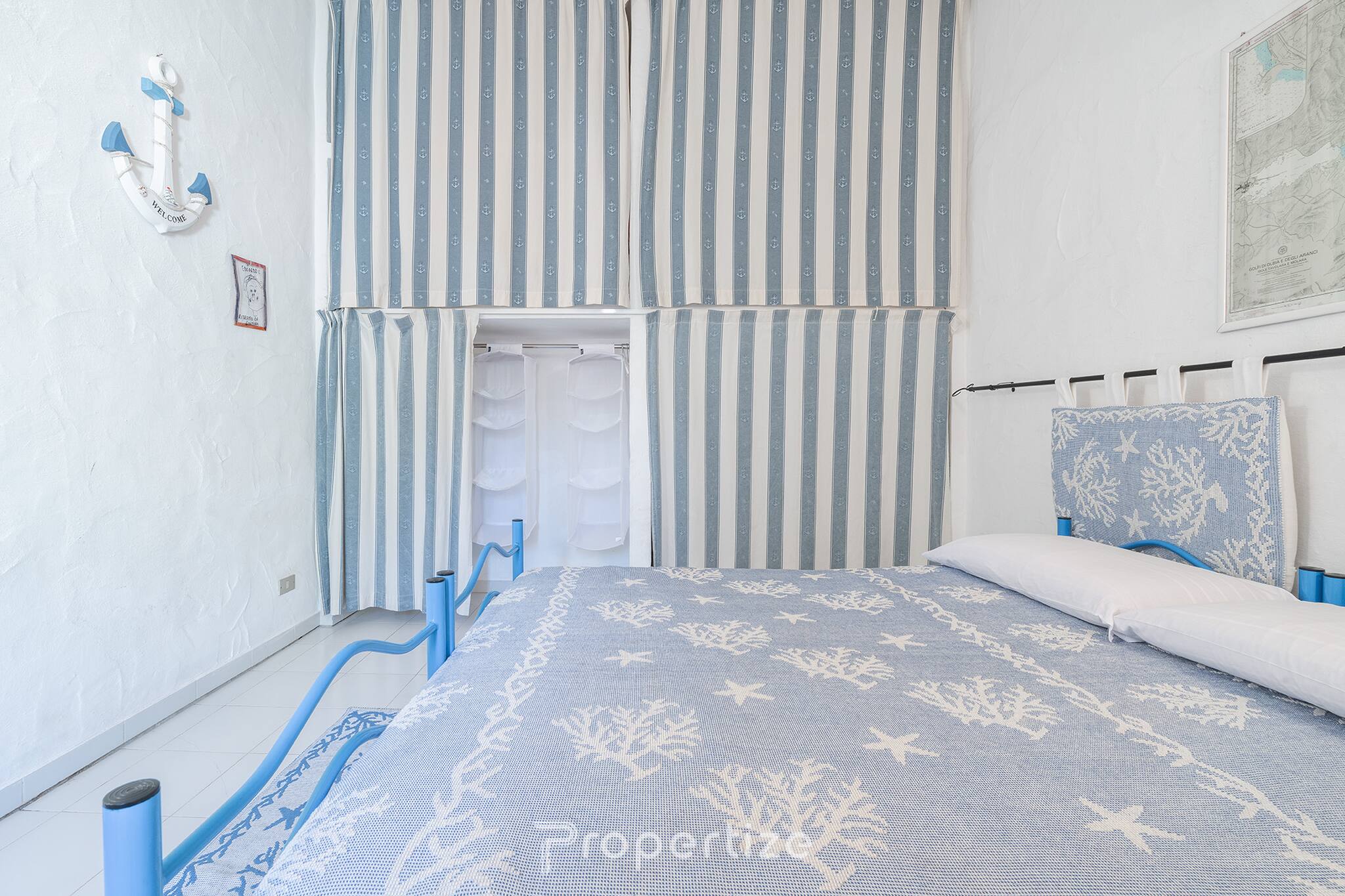 La maison dispose de deux chambres spacieuses, toutes deux climatisées. La première offre un lit king-size, un espace de travail et un grand placard situé dans un espace séparé ; la seconde est meublée avec un lit double et un placard, donnant sur une cour tranquille. Il y a à la fois une salle de bain intérieure et une salle de bain extérieure, particulièrement pratique au retour de la mer.