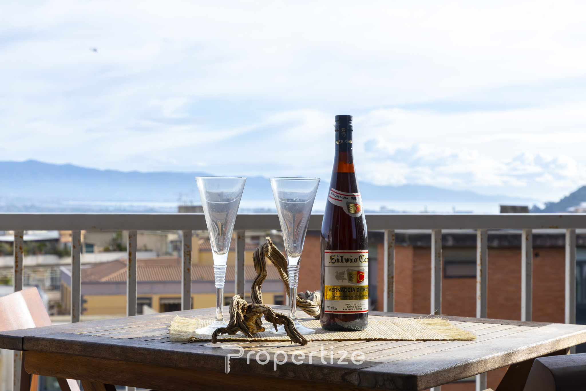 Il vero punto di forza è la terrazza panoramica, collegata direttamente al soggiorno, con una vista aperta sulla città e sul mare. Un angolo ideale per un caffè al mattino, una cena all’aperto o semplicemente per ammirare il panorama dopo una giornata in città.