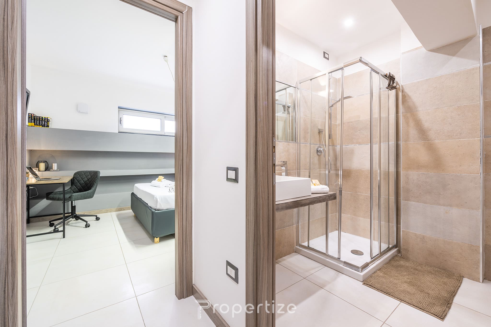 La camera matrimoniale è accogliente e curata, con armadiatura su misura e dettagli di design artigianale che rendono l’atmosfera calda e ricercata. Il bagno, moderno e raffinato, offre una doccia walk-in, lavabo di design e finiture selezionate.