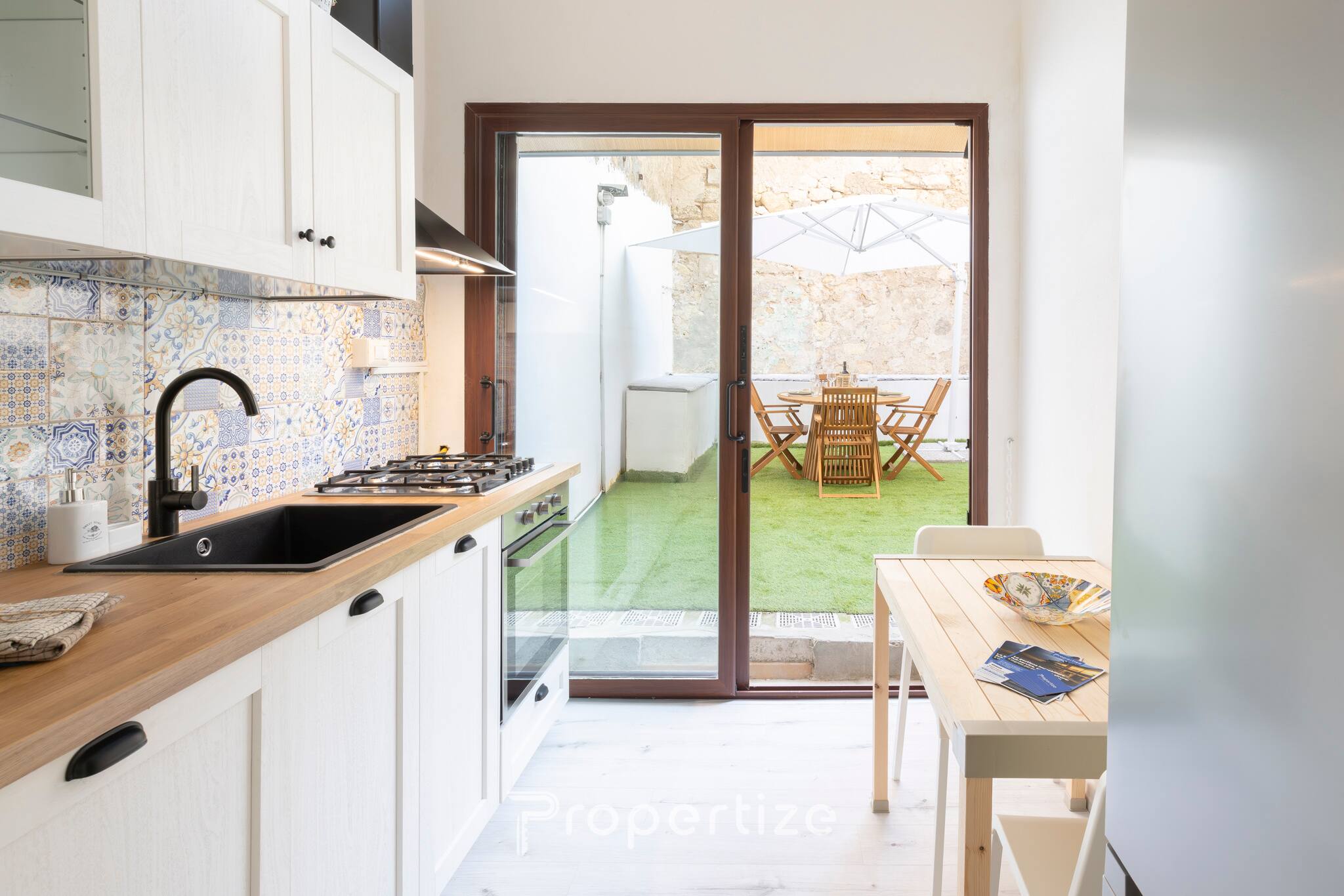 De keuken is modern en goed uitgerust met een oven, magnetron en vaatwasser, met toegang tot een klein balkon dat ideaal is voor een kopje koffie of om wat frisse lucht te happen. Er is ook een wasmachine beschikbaar, geplaatst in een privé wasruimte die is verbonden met een van de kamers. De ruimtes zijn ontworpen om te ontspannen, te werken of samen te eten op een praktische en comfortabele manier.