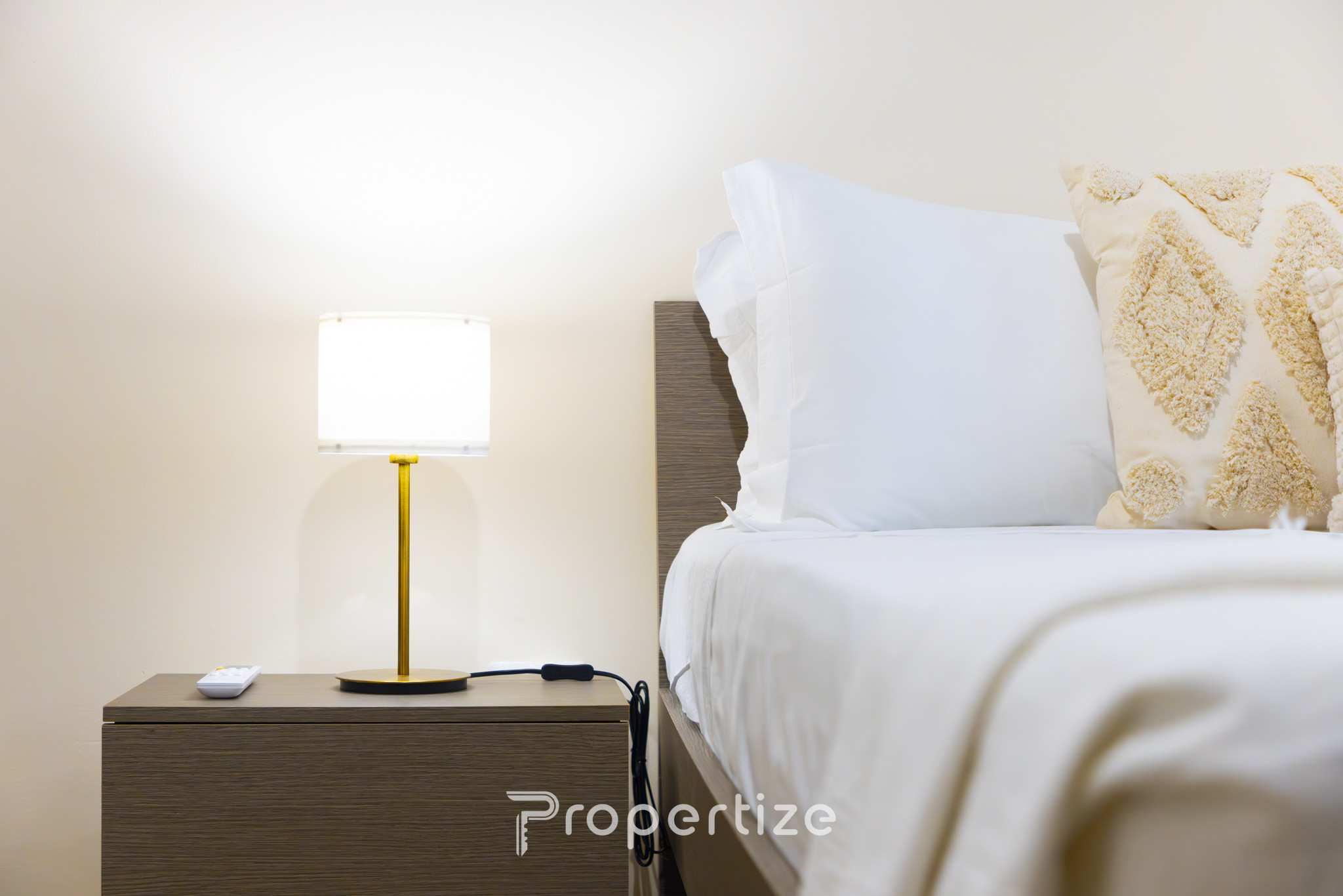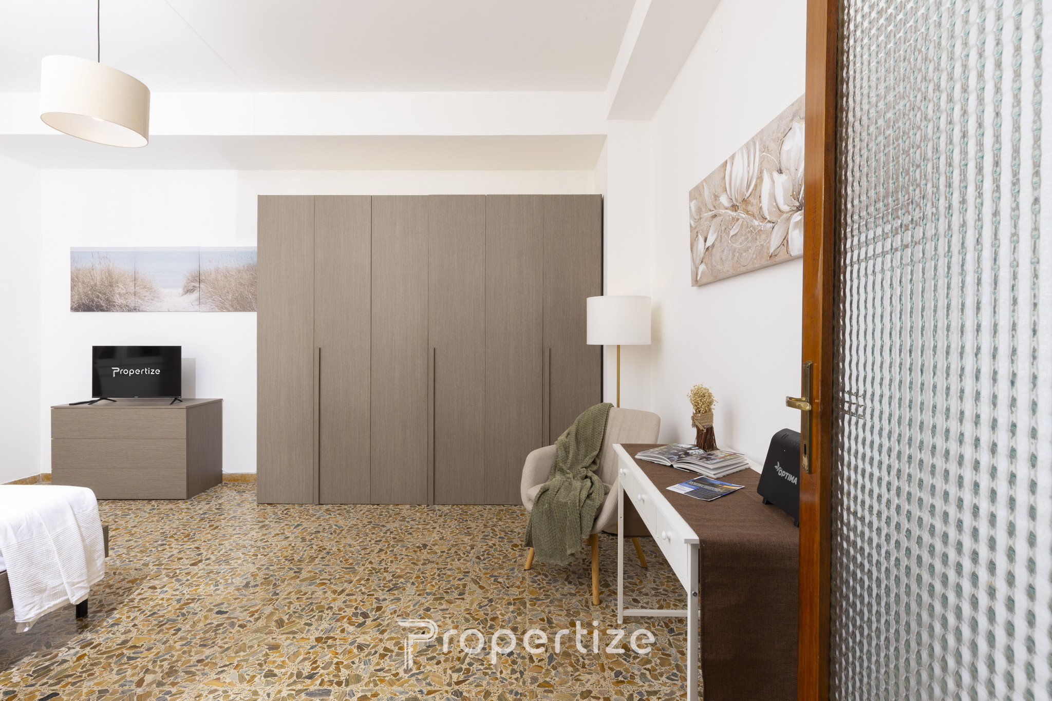 De open space is licht en harmonieus, met een dag- en nachtzone die duidelijk zijn gedefinieerd dankzij een scenografische wand van decoratief glas met achtergrondverlichting, die karakter en privacy geeft zonder licht weg te nemen. De nachtzone biedt een tweepersoonsbed met een premium matras, smart-tv en een ruime kledingkast. Voor wie onderweg werkt, is er een complete ergonomische werkplek met een verstelbaar bureau, een professionele stoel en een extern scherm.