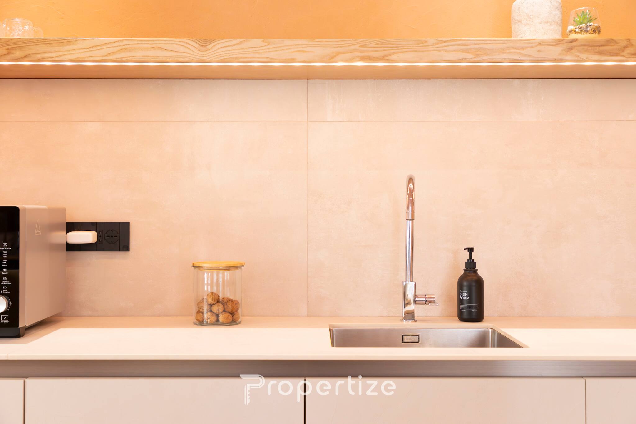 De woonzone verwelkomt een comfortabele slaapbank en een houten eettafel, naast een super uitgeruste keuken met inductieplaat, oven, magnetron, vaatwasser, wasmachine en koffiezetapparaat. De badkamer, met een hedendaags design, is voorzien van een walk-in douche, een elegante wastafel, een achtergrondverlichte spiegel en toiletartikelen.