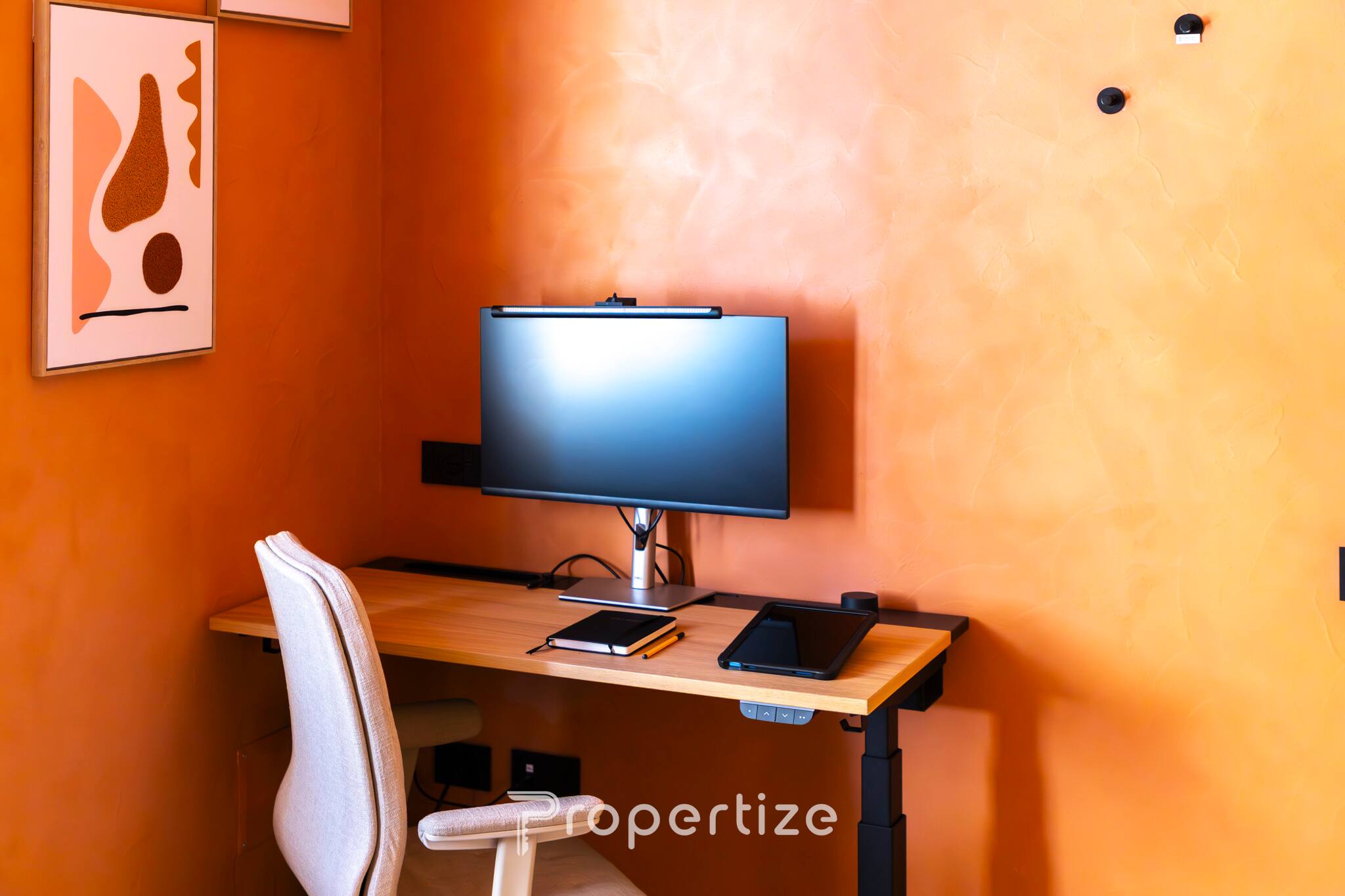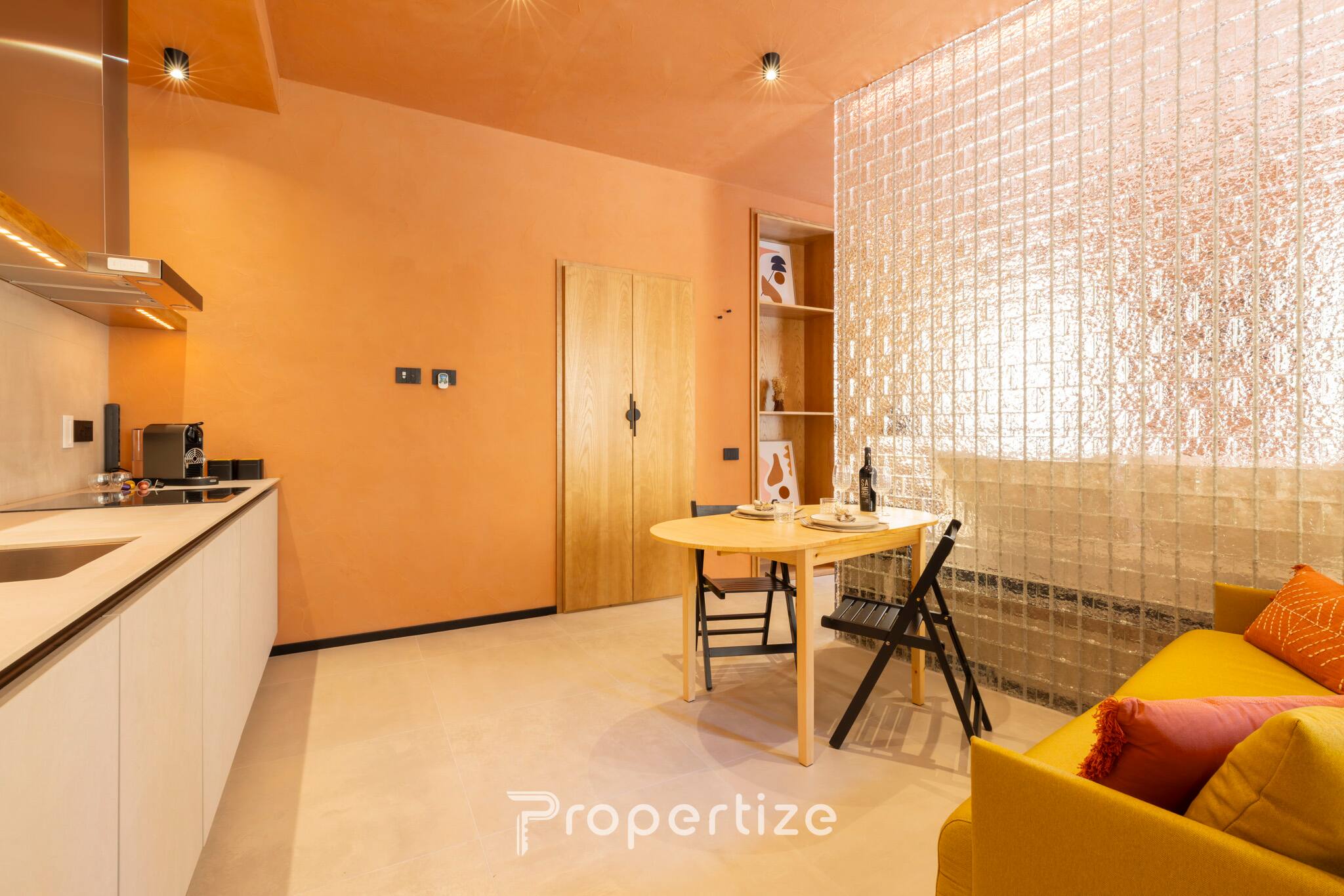 De open space is licht en harmonieus, met een dag- en nachtzone die duidelijk zijn gedefinieerd dankzij een scenografische wand van decoratief glas met achtergrondverlichting, die karakter en privacy geeft zonder licht weg te nemen. De nachtzone biedt een tweepersoonsbed met een premium matras, smart-tv en een ruime kledingkast. Voor wie onderweg werkt, is er een complete ergonomische werkplek met een verstelbaar bureau, een professionele stoel en een extern scherm.