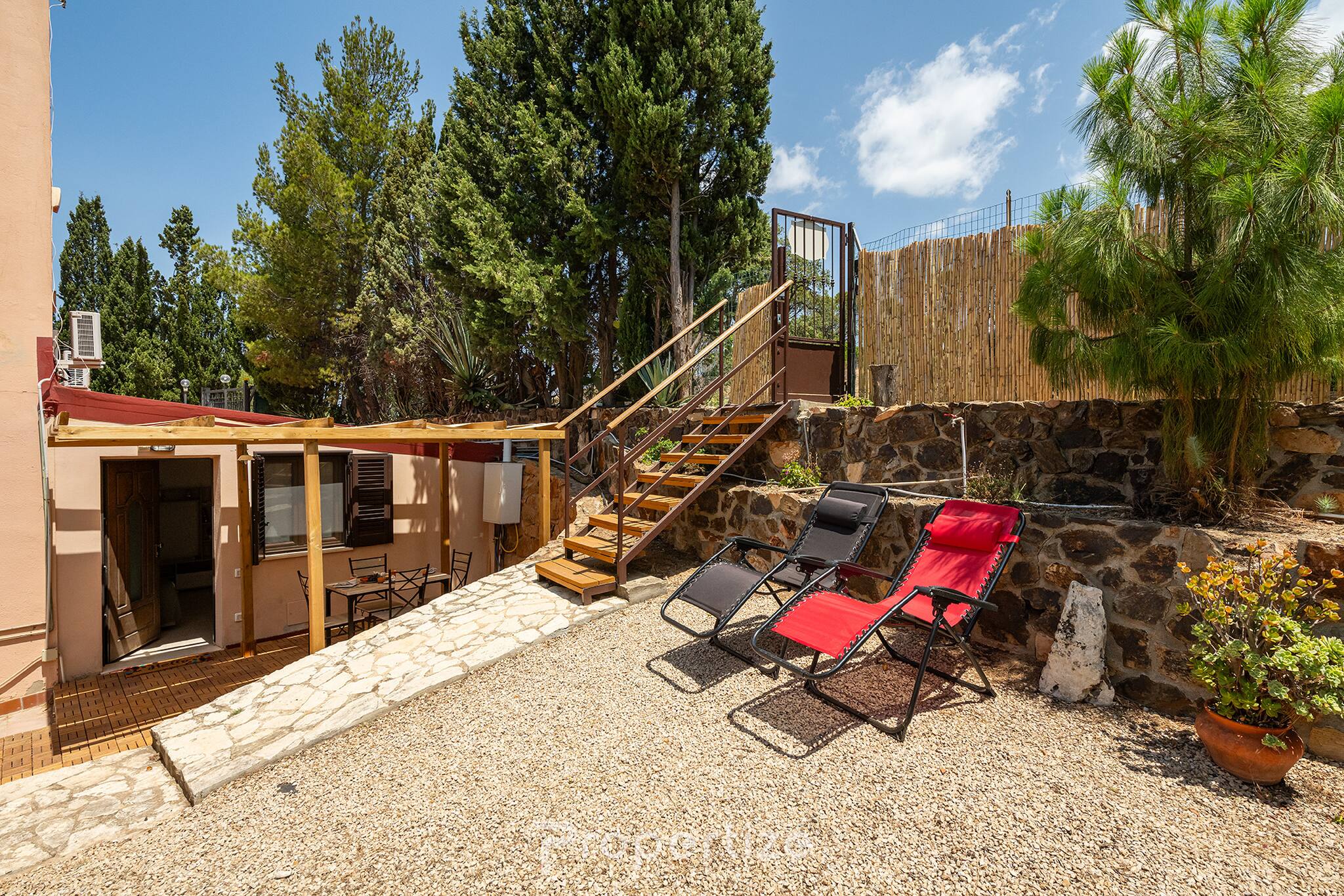Het echte sterke punt zijn de buitenruimtes. Voor het huis vind je een buiteneetruimte, een solarium en een buitendouche te midden van bomen en bergen, perfect na een dag aan zee of op de warmste dagen. Aan de achterkant creëert een binnenplaats met een paviljoen en een loungeruimte met tafel en stoelen een rustige hoek om rustig te genieten, tussen het lezen, kletsen en avonden onder de sterren.