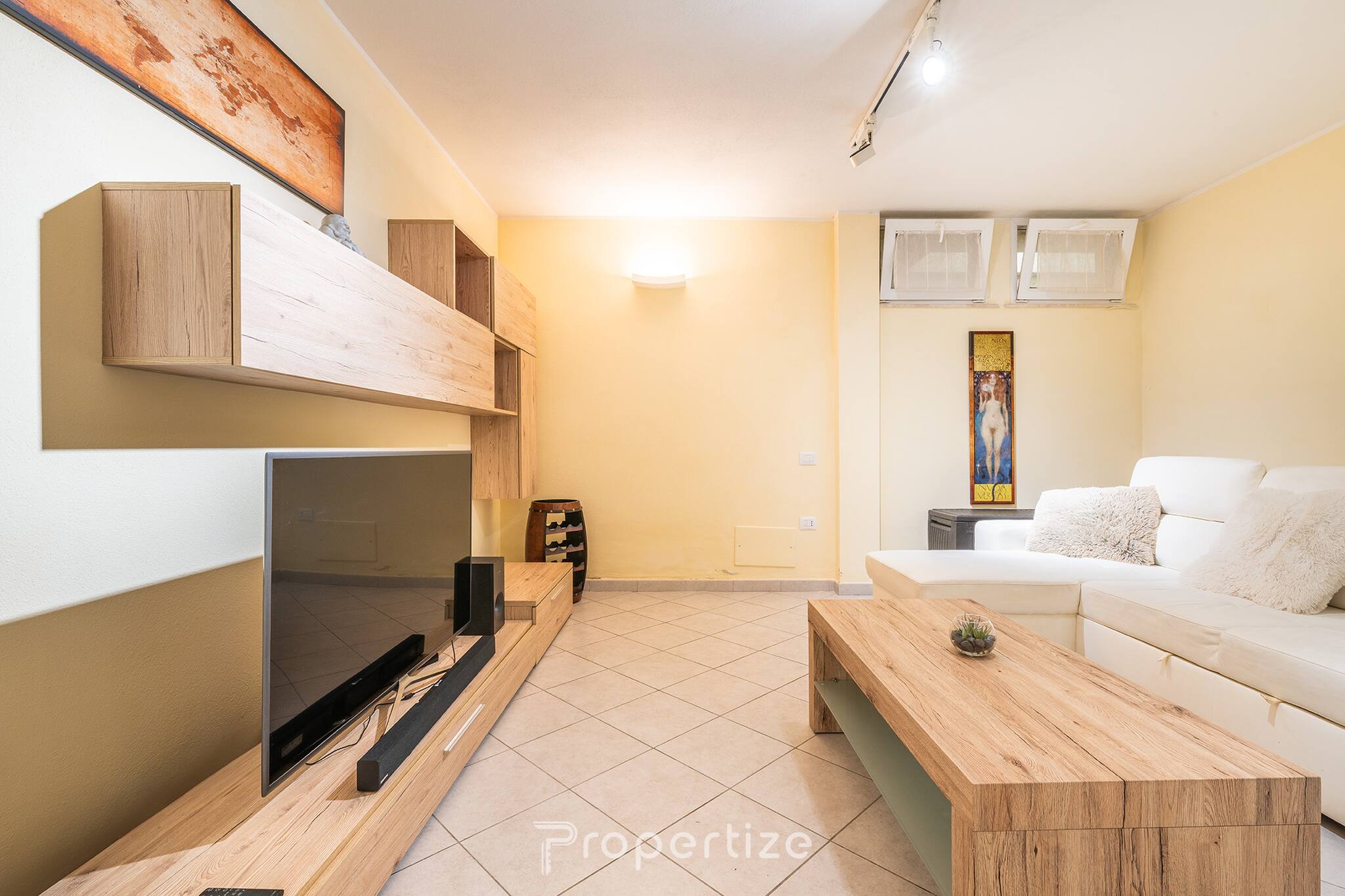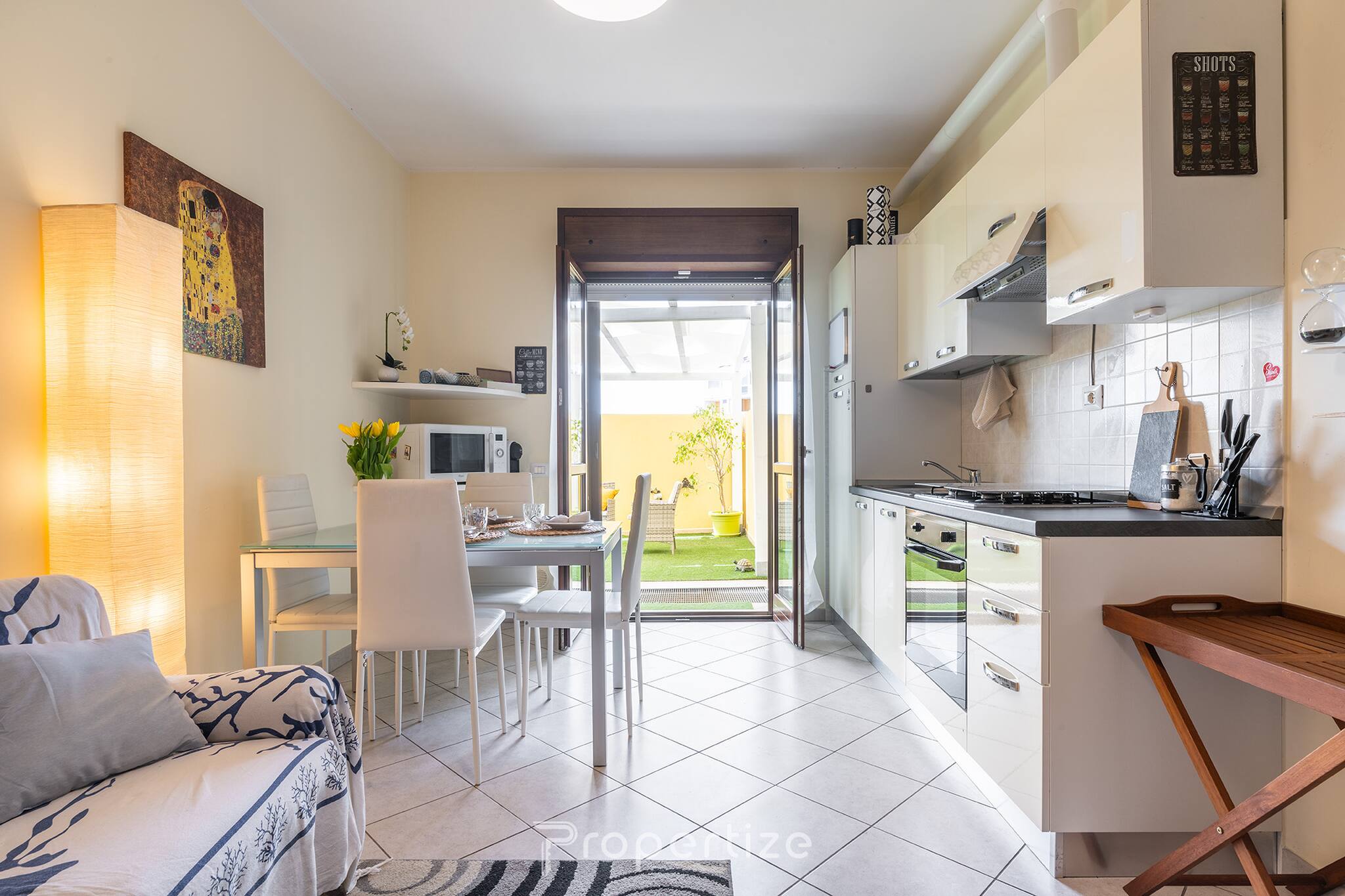 Binnen verwelkomt je een praktische en goed georganiseerde woonkamer, met bank en open keuken. De keuken is voorzien van apparatuur en alles wat essentieel is om te koken, perfect voor trage ontbijten of diners met gezelschap. Het terras is handig verbonden met de woonruimte, waardoor buiten eten heel eenvoudig wordt.