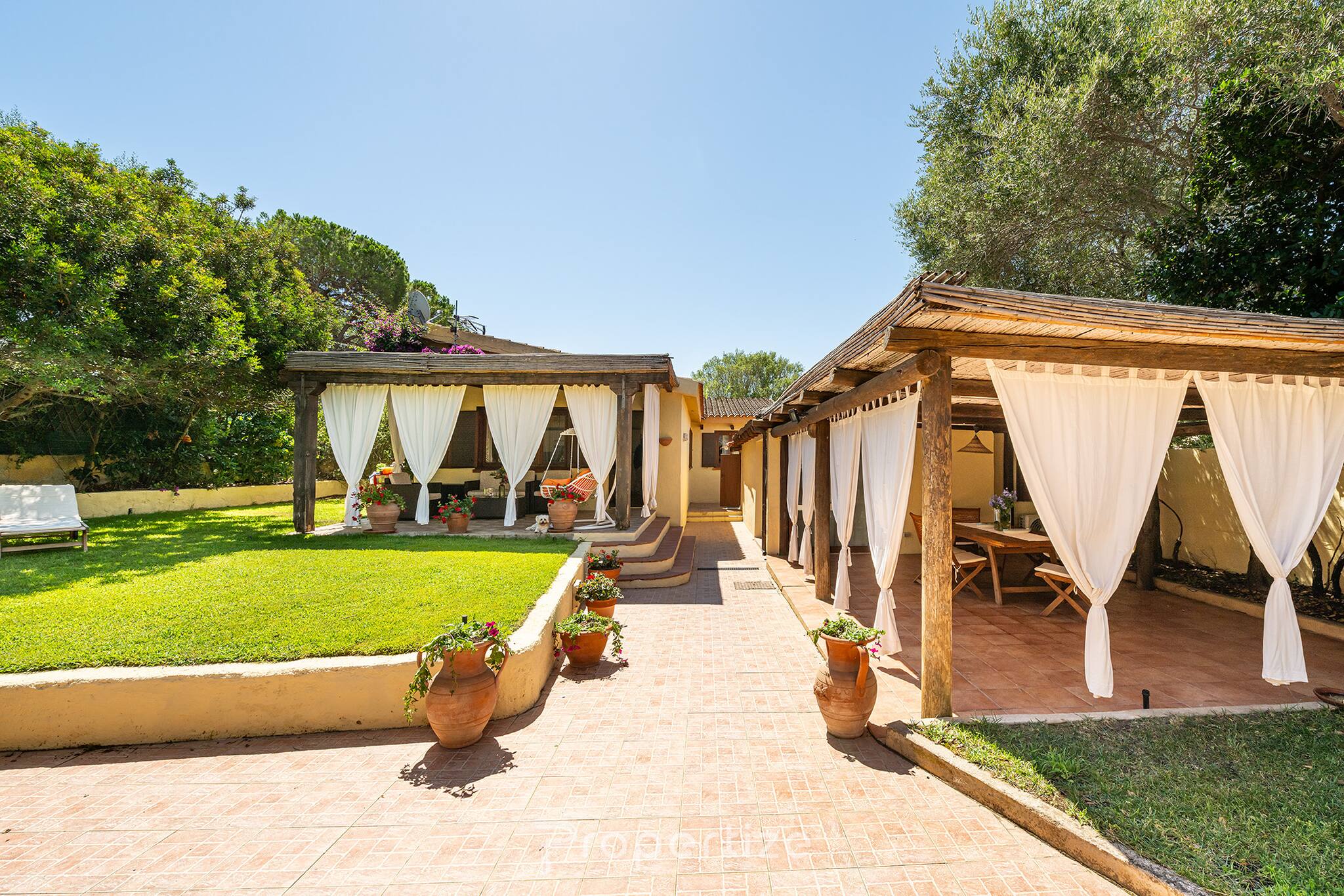 Geniet van het beste van noordoost-Sardinië in dit huis in Pittulongu, op slechts 100 meter van het strand. Perfect voor gezinnen, het is een woning op twee niveaus die zorgvuldig is ingericht, met een elegante maritieme stijl en een ontspannen sfeer, omgeven door vegetatie.