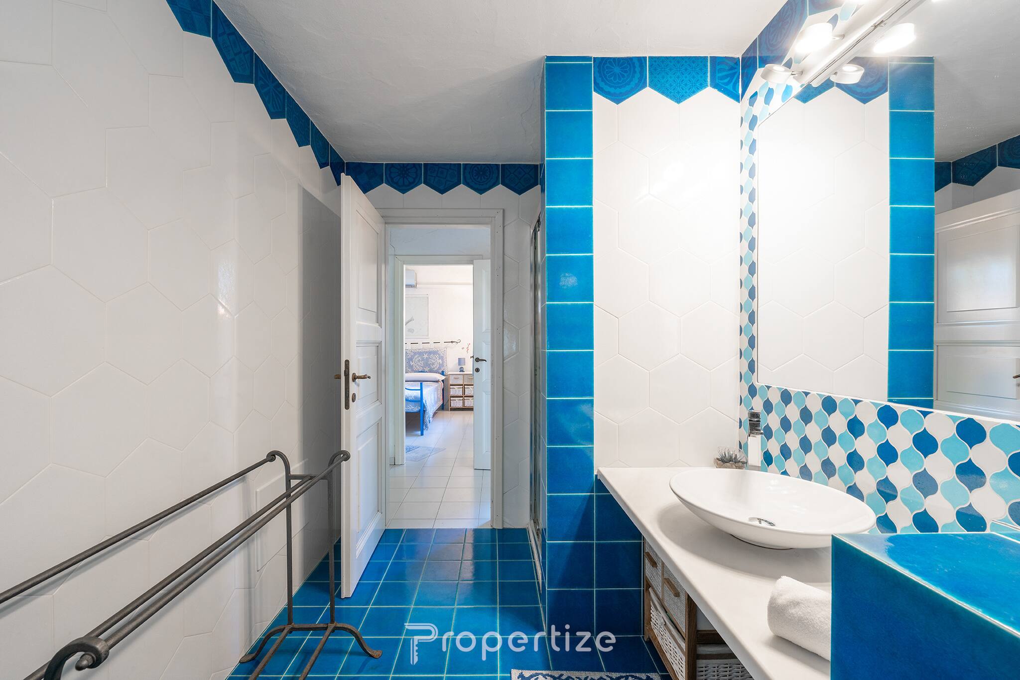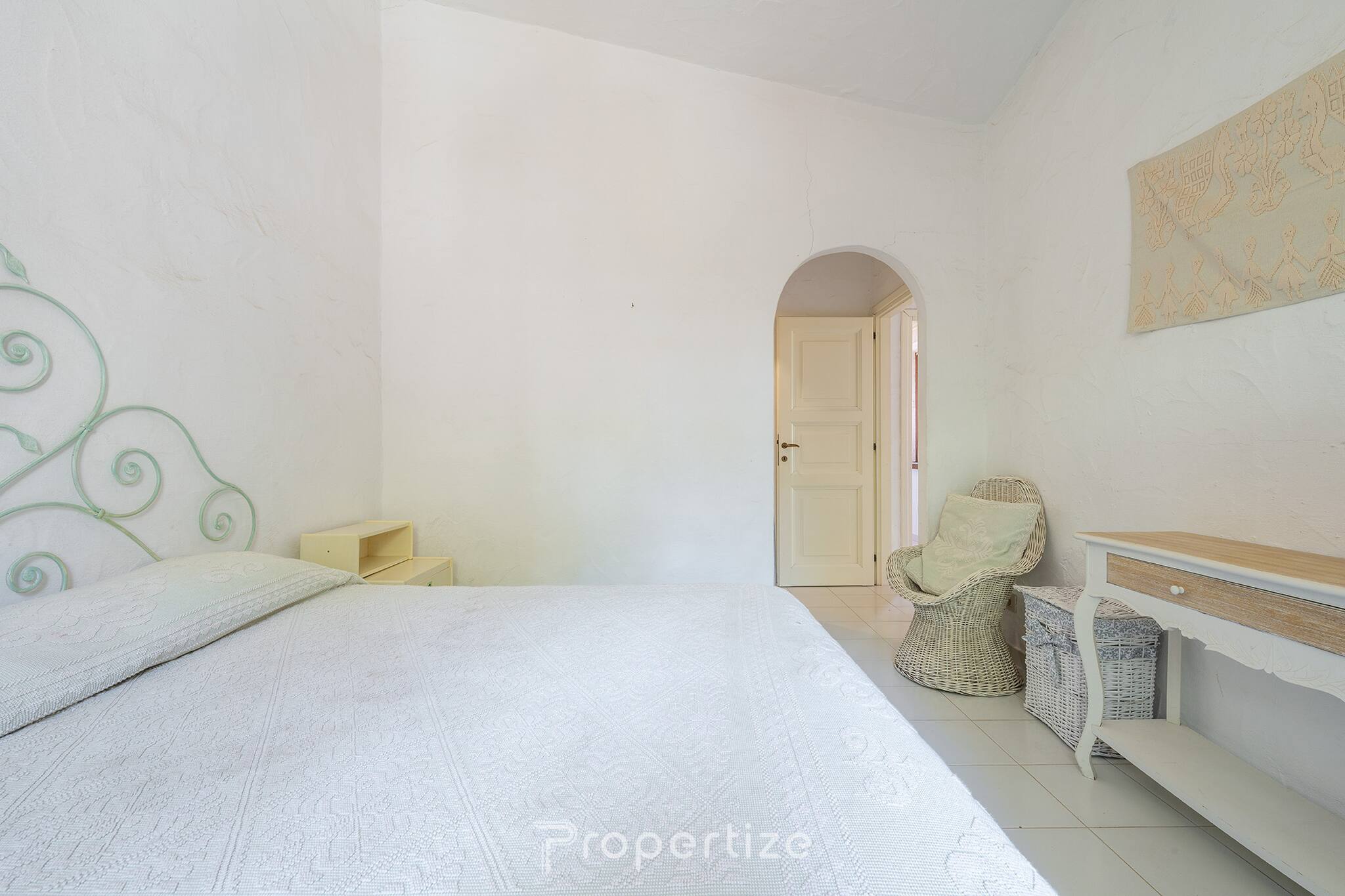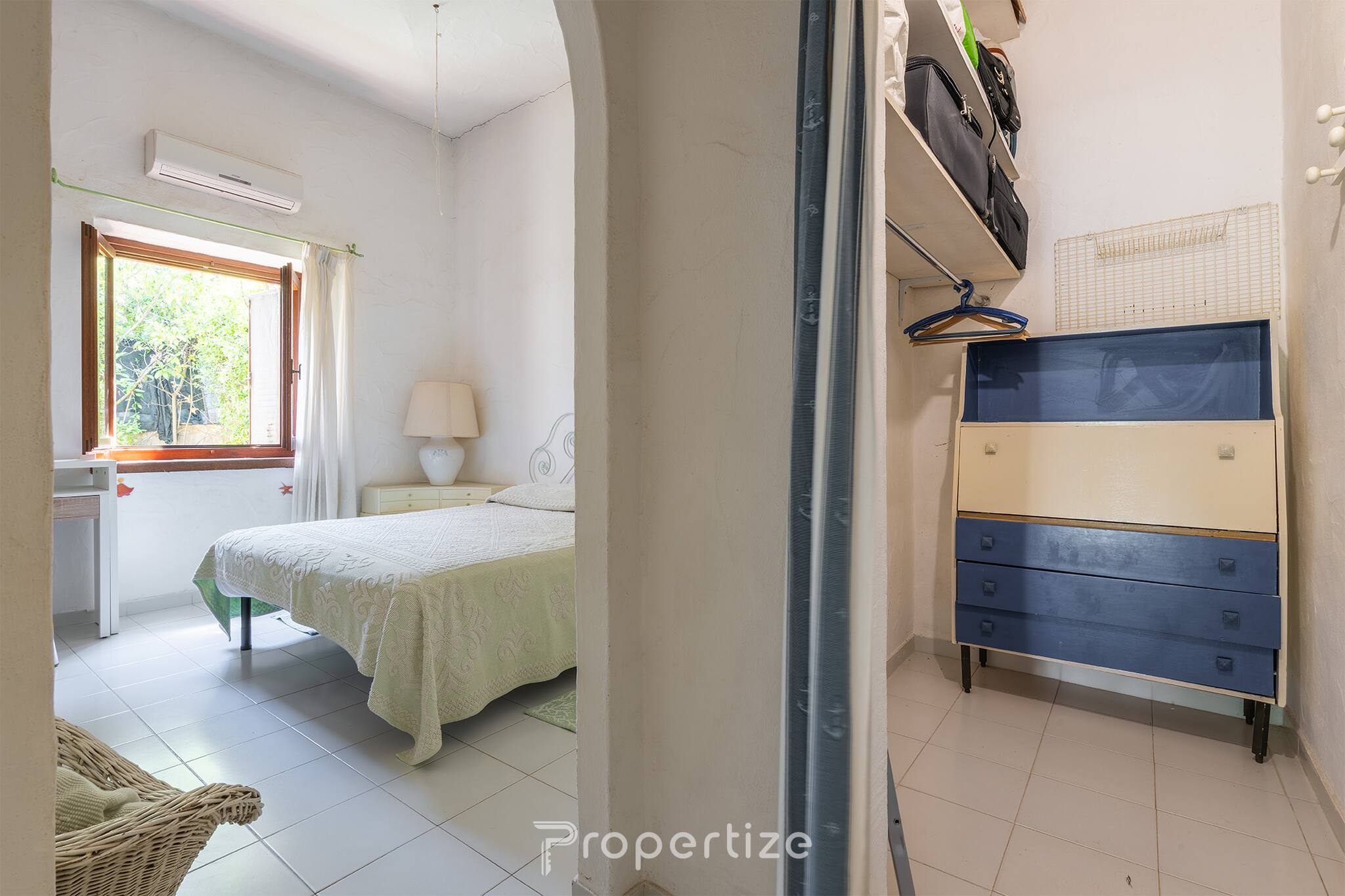 Het huis beschikt over twee ruime slaapkamers, beide voorzien van airconditioning. De eerste biedt een kingsize bed, een werkruimte en een grote kast die zich in een aparte ruimte bevindt; de tweede is ingericht met een tweepersoonsbed en een kast, met uitzicht op de rustige binnenplaats. Er is zowel een badkamer binnenshuis als een buitenbadkamer, die bijzonder handig is na terugkomst van het strand.