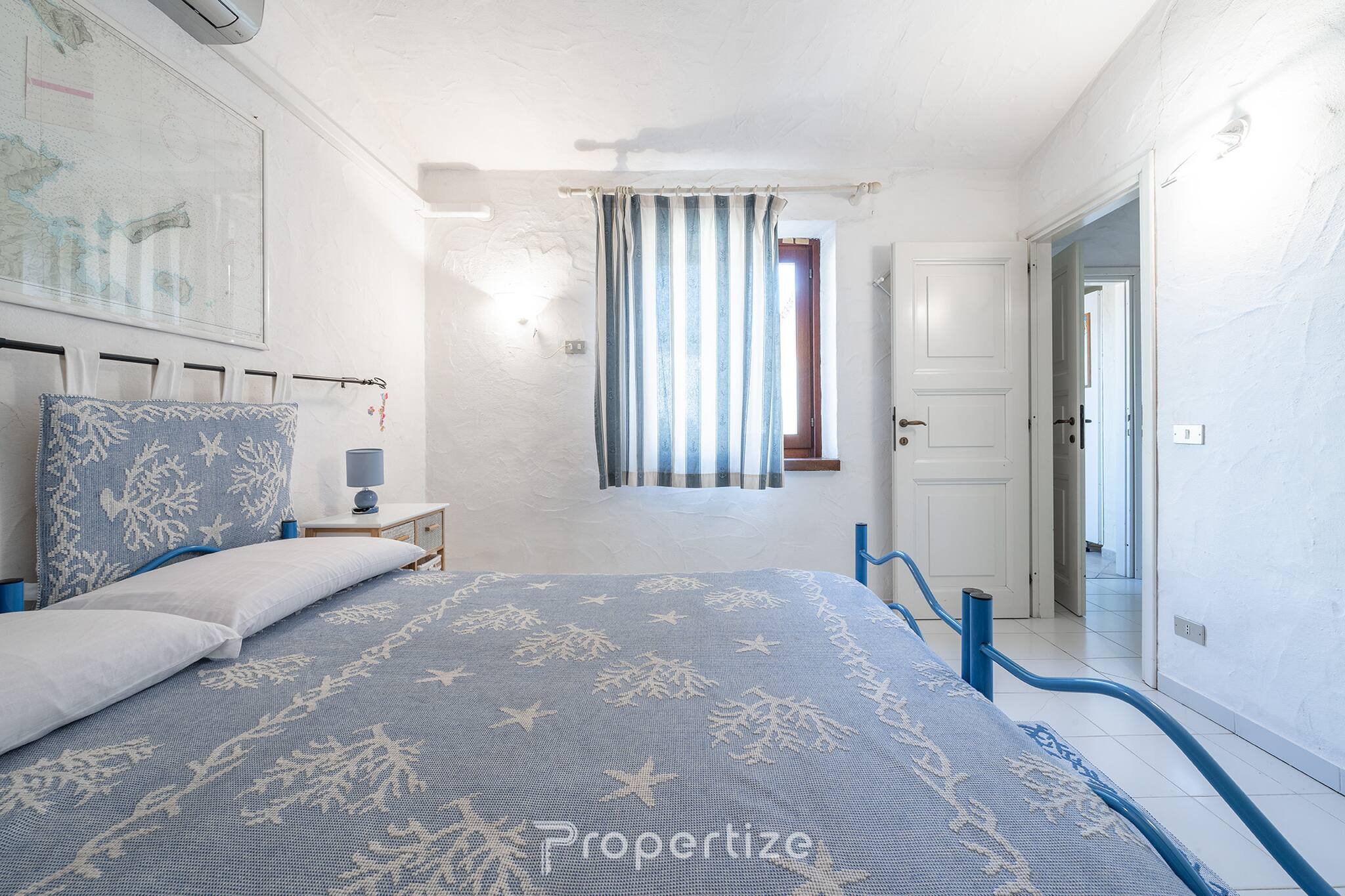 Het huis biedt drie ruime tweepersoonskamers, allemaal voorzien van airconditioning en ingericht met verwijzingen naar de zee, ideaal om rustig uit te rusten na een dag in de zon. Er zijn twee badkamers met een douche, voorzien van een toiletset en handdoeken, ontworpen om comfort en gemak te bieden aan alle gasten.