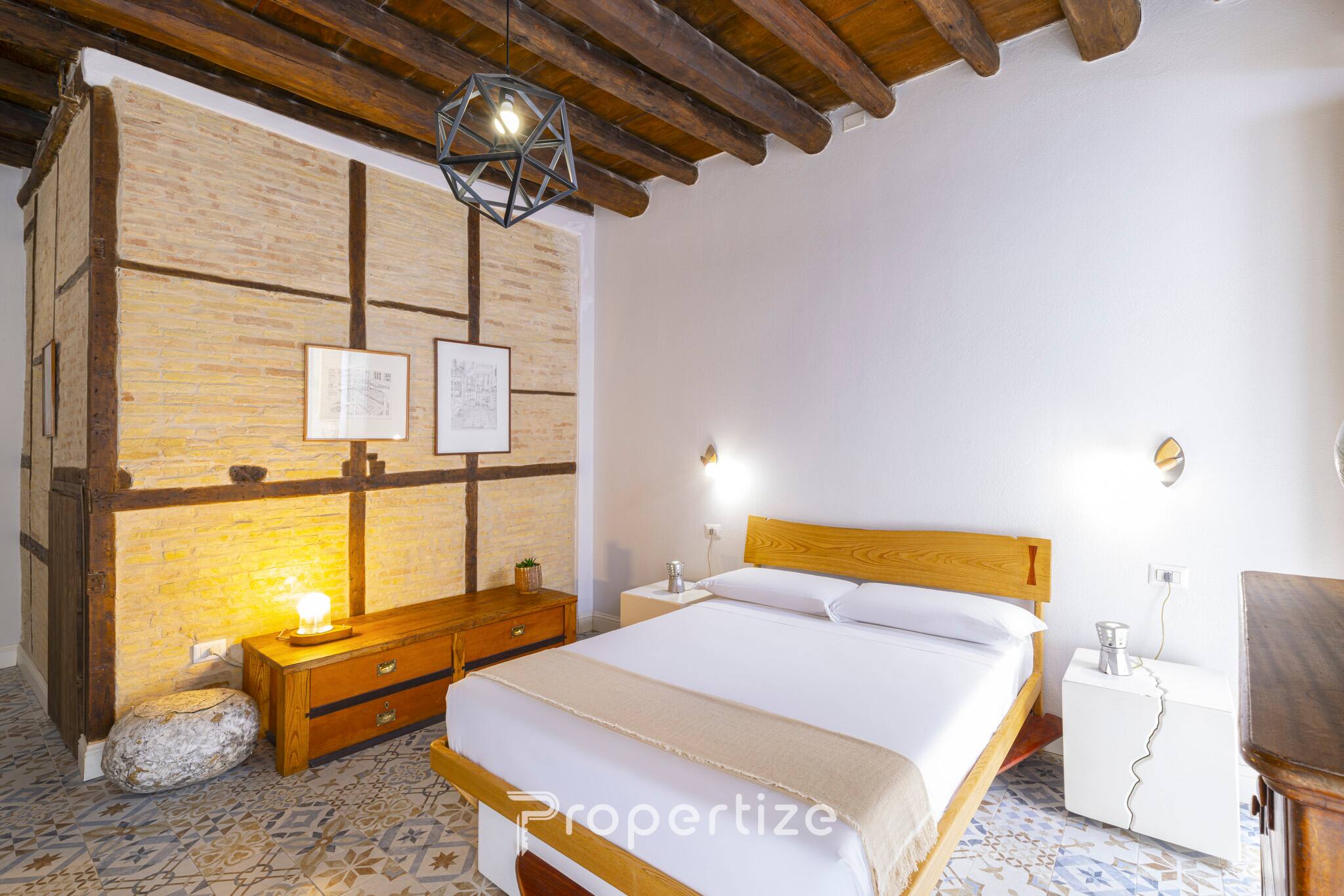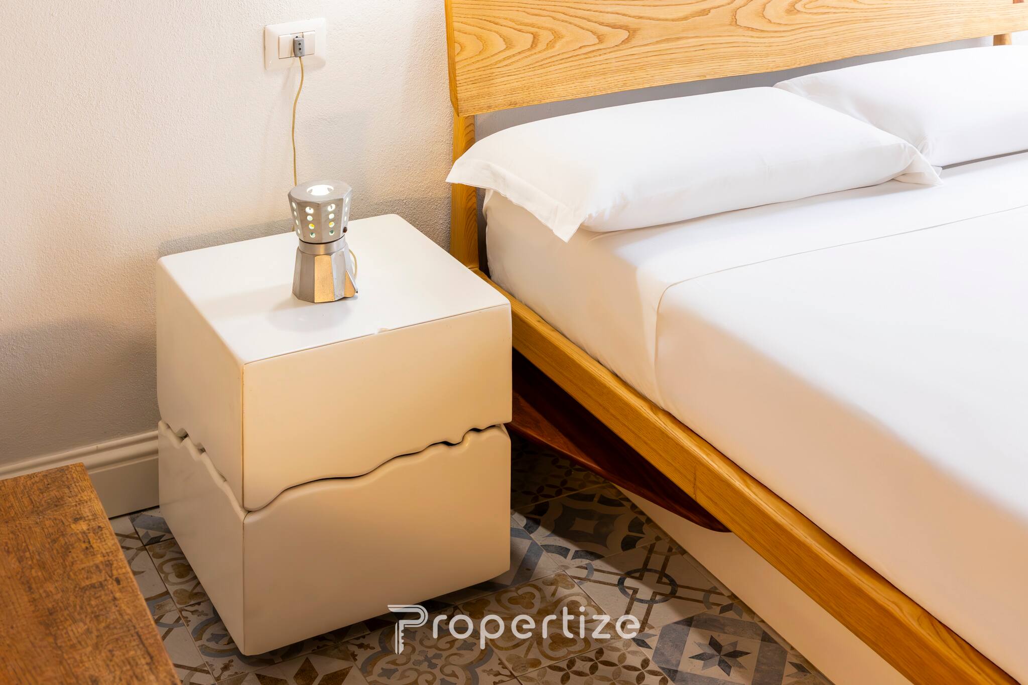 Otwarta przestrzeń jest jasna i harmonijna, z dobrze zdefiniowaną strefą dzienną i nocną dzięki scenograficznej ścianie z podświetlanego szkła dekoracyjnego, która nadaje charakteru i prywatności, nie zabierając światła. Strefa nocna oferuje łóżko małżeńskie z premium materacem, smart TV i obszerną szafą. Dla osób pracujących w podróży, dostępne jest ergonomiczne stanowisko pracy z regulowanym biurkiem, profesjonalnym krzesłem i zewnętrznym monitorem.