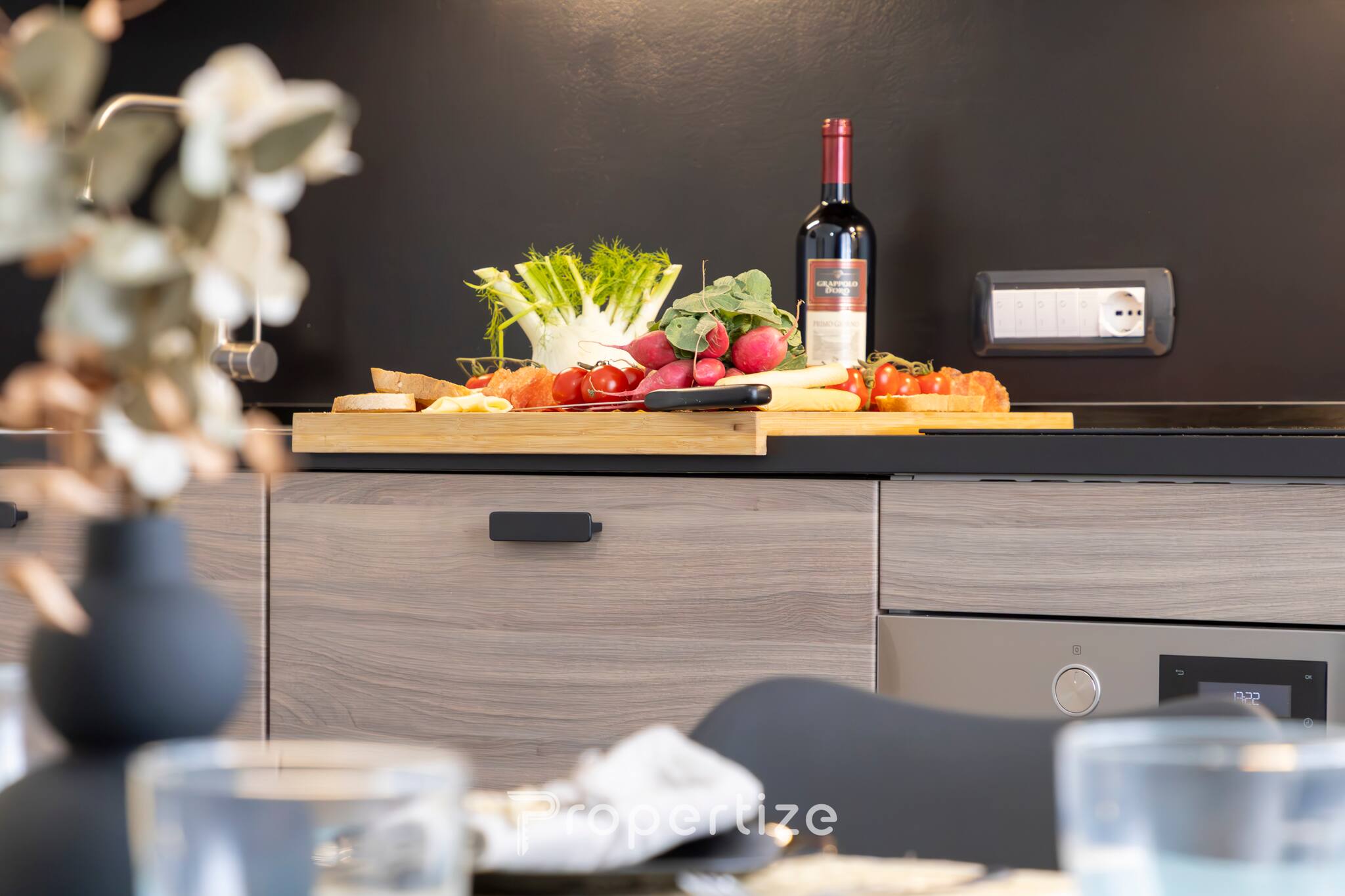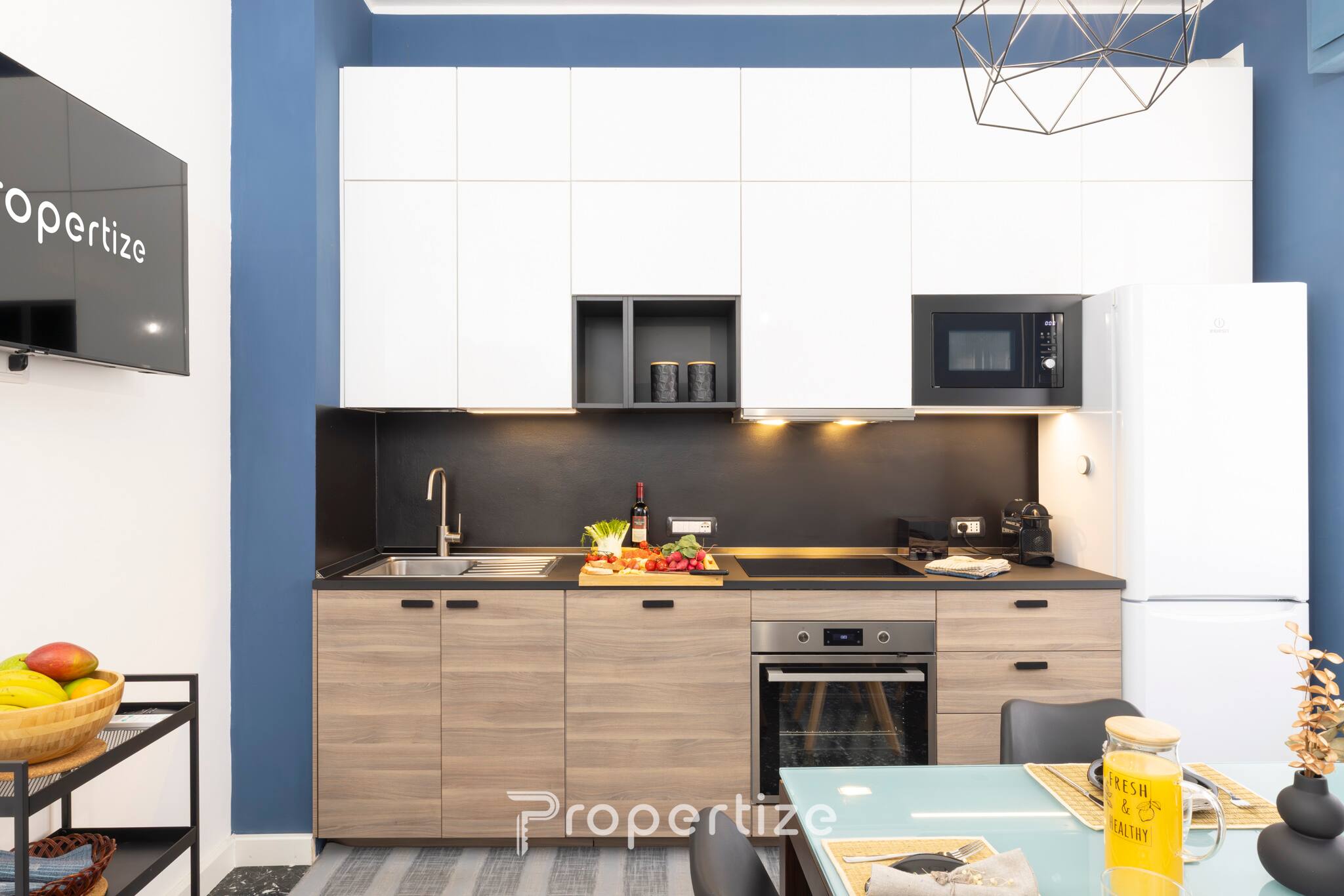 Kuchnia jest nowoczesna i dobrze wyposażona w piekarnik, mikrofalówkę i zmywarkę, z dostępem do małego balkonu idealnego na kawę lub zaczerpnięcie świeżego powietrza. Dostępna jest również pralka, umieszczona w prywatnej strefie prania podłączonej do jednego z pokoi. Przestrzenie zostały zaprojektowane z myślą o relaksie, pracy lub wspólnym spożywaniu posiłków w praktyczny i wygodny sposób.