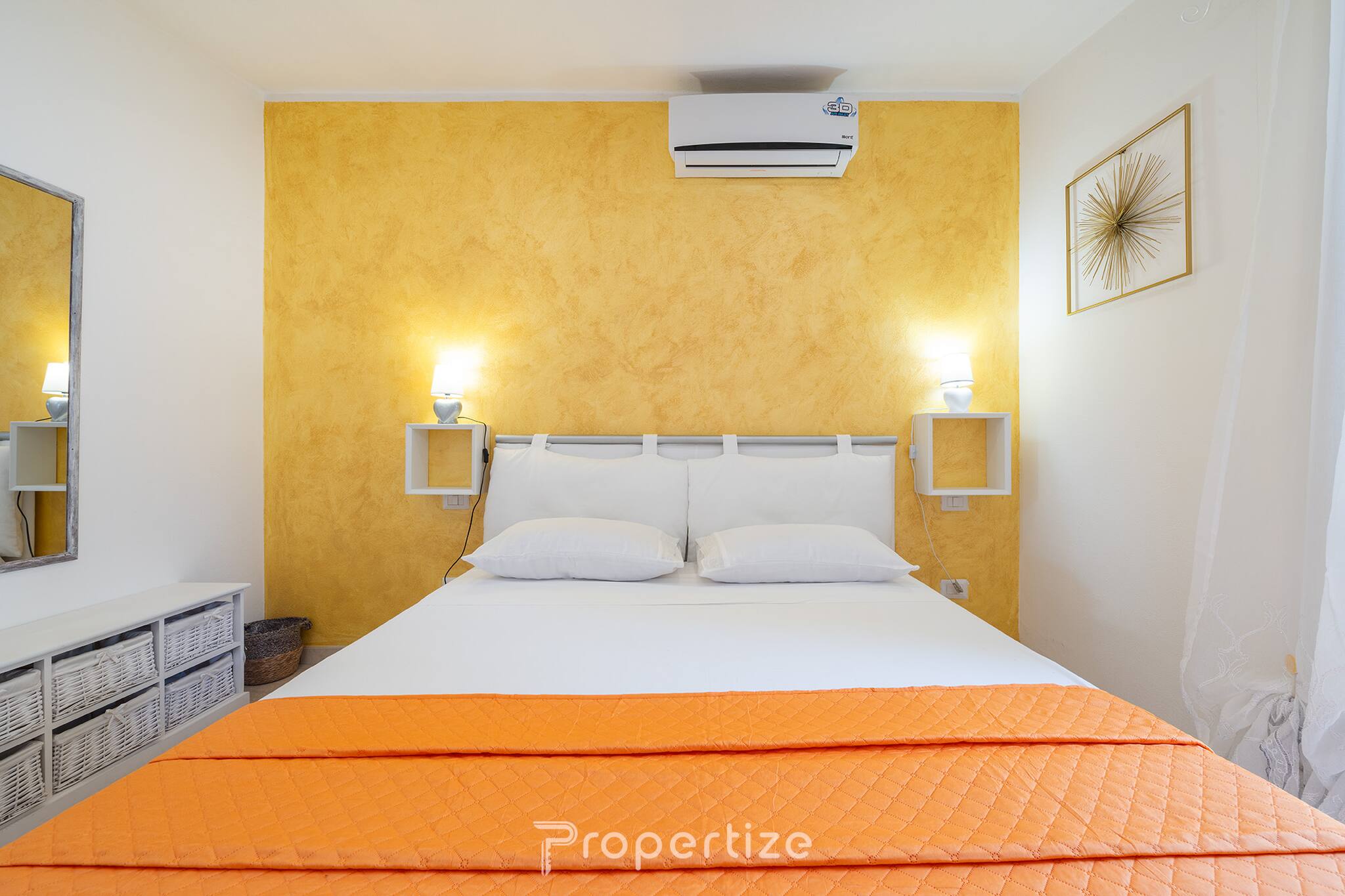 Wnętrza są jasne i zadbane, idealne dla par, rodzin lub przyjaciół. Sypialnia małżeńska jest intymna i przytulna, klimatyzowana, z pełną pościelą i bezpośrednim dostępem do patio z tyłu, gdzie czeka na Ciebie strefa relaksu tylko dla Ciebie. Strefa dzienna jest wygodna i przyjazna, z rozkładaną sofą dla dwóch osób, telewizorem i klimatyzacją, idealna na powrót wieczorem i natychmiastowe poczucie bycia w domu.