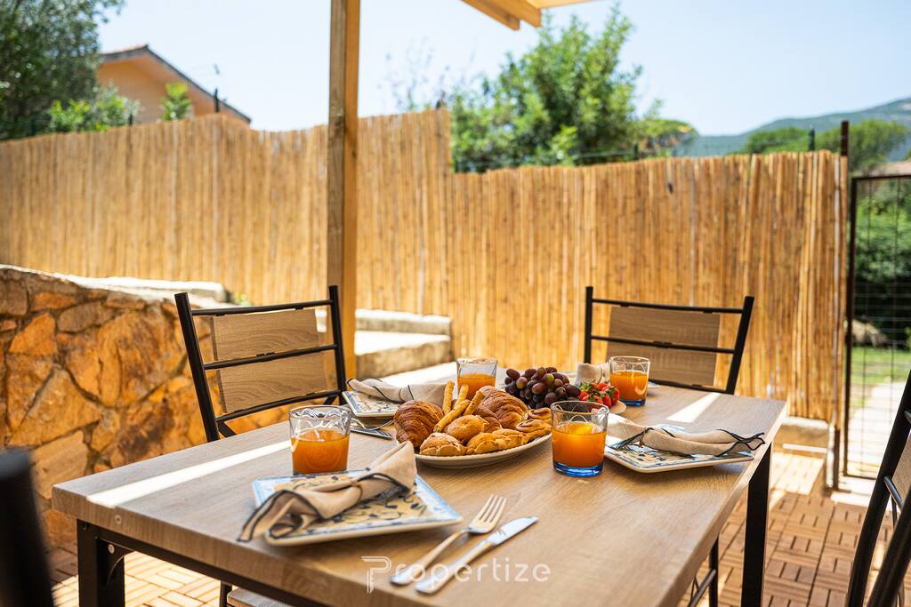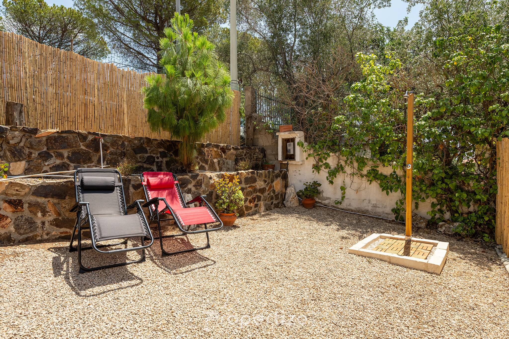 Prawdziwym atutem są przestrzenie zewnętrzne. Przed domem znajduje się strefa jadalna na świeżym powietrzu, taras słoneczny i prysznic zewnętrzny ukryty wśród drzew i gór, idealny po kąpieli morskiej lub w najgorętsze dni. Z tyłu, dziedziniec z altaną i strefą wypoczynkową z tabletem i krzesłami tworzy spokojny kącik do spokojnego spędzania czasu, wśród lektur, rozmów i wieczorów pod gwiazdami.