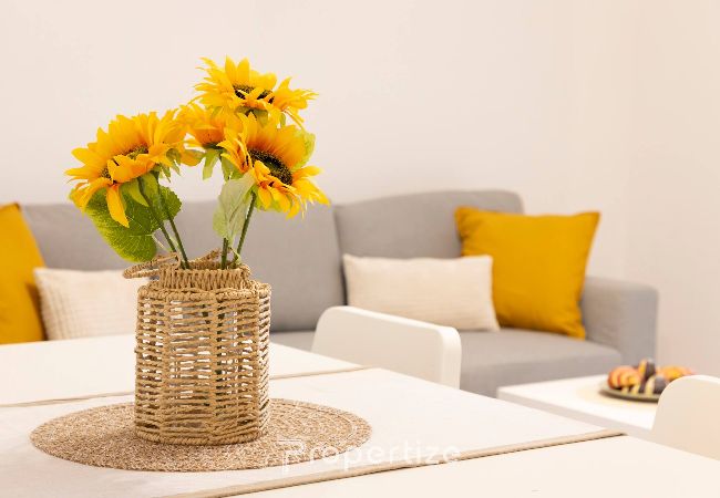 O apartamento pode acolher até 6 pessoas e dispõe de uma ampla sala de estar com sofá-cama e TV, cozinha em open space com zona de refeições e acesso direto ao terraço, e dois quartos com cama de casal, roupeiros e luz natural, um dos quais com projetor.