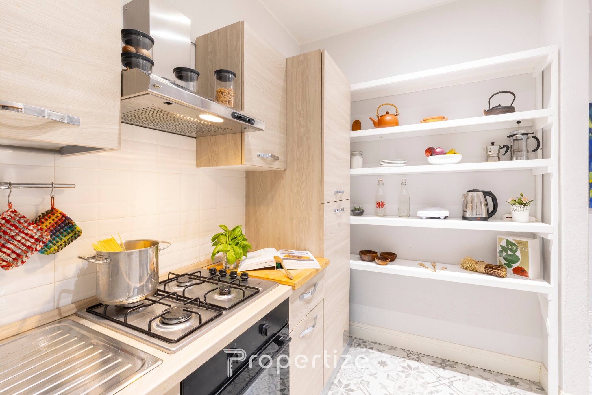 Uma cozinha completamente equipada com forno, fogão a gás, moka, chaleira e todos os acessórios essenciais