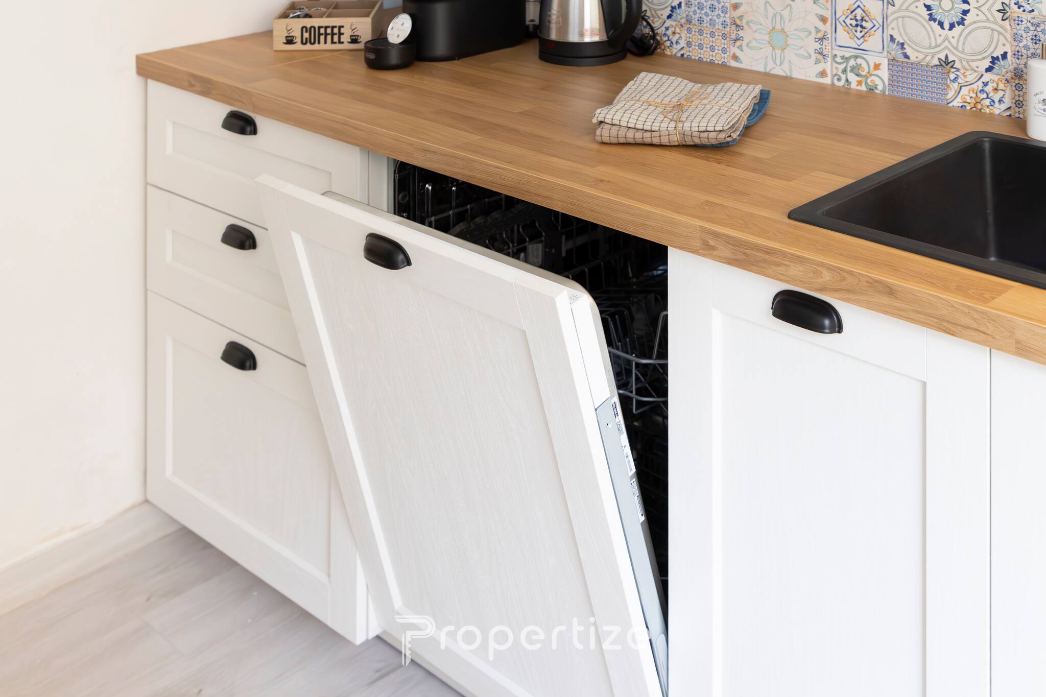 The kitchen is equipped with oven, dishwasher, coffee machine, kettle and utensils. The modern bathroom has a walk-in shower, washing machine and towel set.