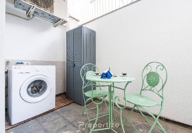 The accommodation is located in a quiet residential area well connected to the centre, with a compact but complete layout, perfect for medium to long stays. You will find a bright living area with sofa bed, dining table and direct access to the patio. The double bedroom is comfortable and features a wardrobe and desk area. The kitchen is equipped with oven, microwave, coffee machine, kettle and toaster, as well as everything necessary for cooking. The bathroom is modern with shower and washing machine, with towels and toiletries included.