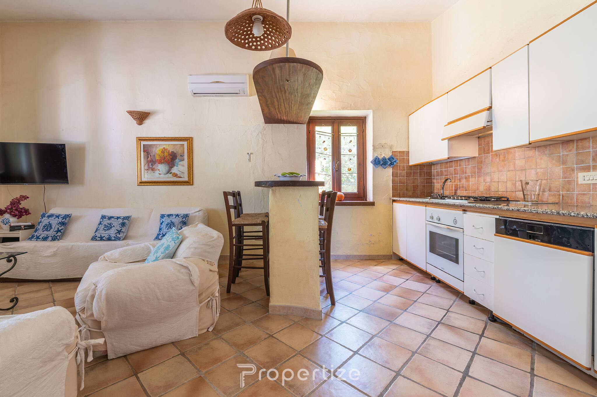 The living room, spacious and bright, is designed for maximum comfort, with a sofa, armchairs, TV and air conditioning. The fully equipped kitchen includes an oven, refrigerator, freezer, hob, capsule coffee machine, kettle and toaster, allowing you to easily prepare meals to enjoy in company.