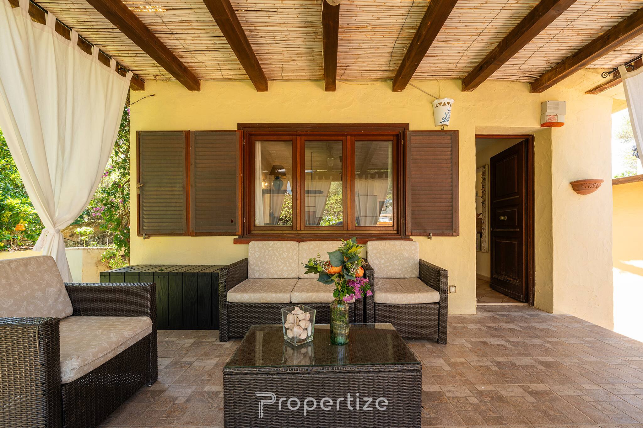 The house has two spacious double bedrooms, both air-conditioned. The first offers a king-size bed, a work area and a large wardrobe located in a separate room; the second is furnished with a double bed and wardrobe, overlooking the quiet courtyard. There is both an internal and an external bathroom, particularly convenient when returning from the sea.